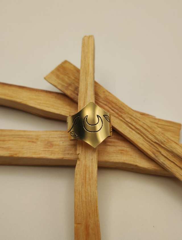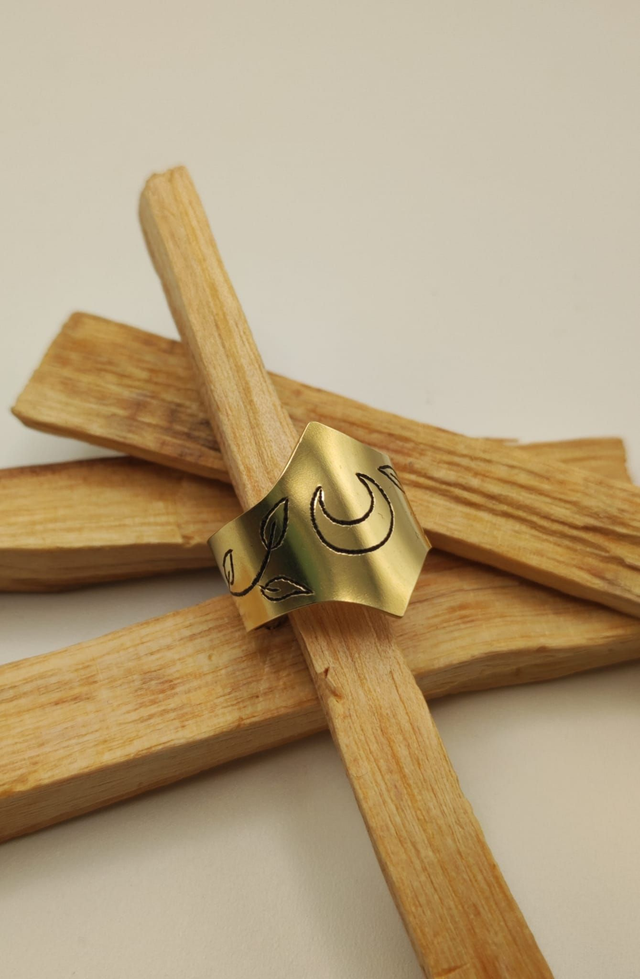 Bague en laiton brut gravé d'un croissant de lune et de feuillages.