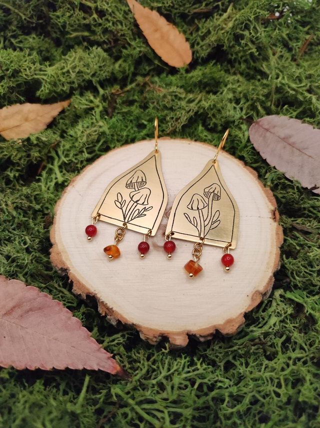 Boucles d'oreilles en laiton gravé, perles de cornaline et d'ambre.