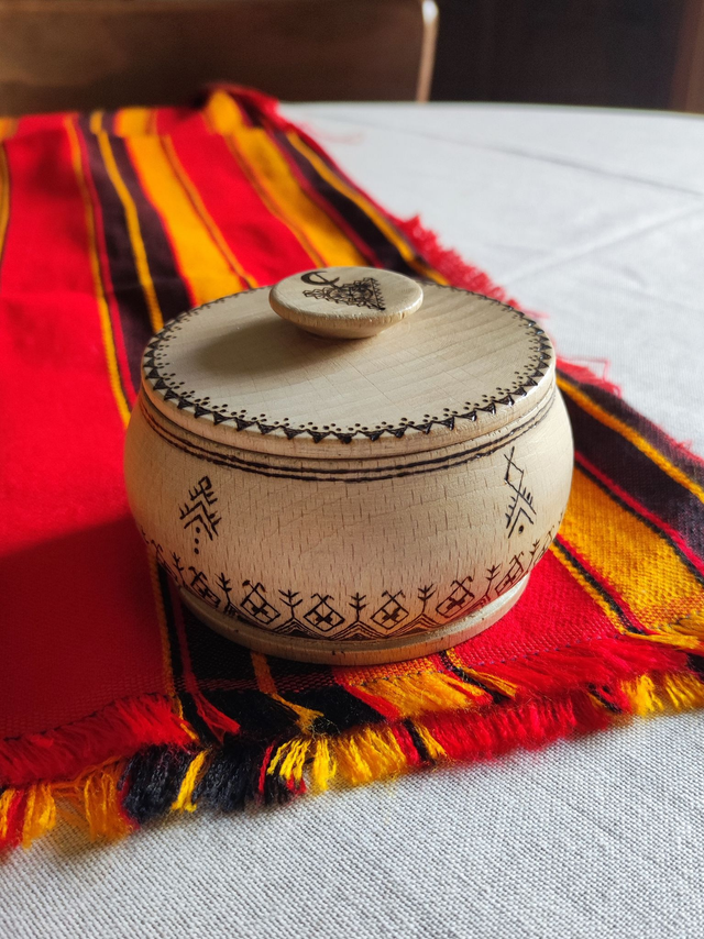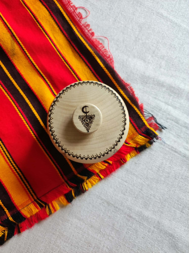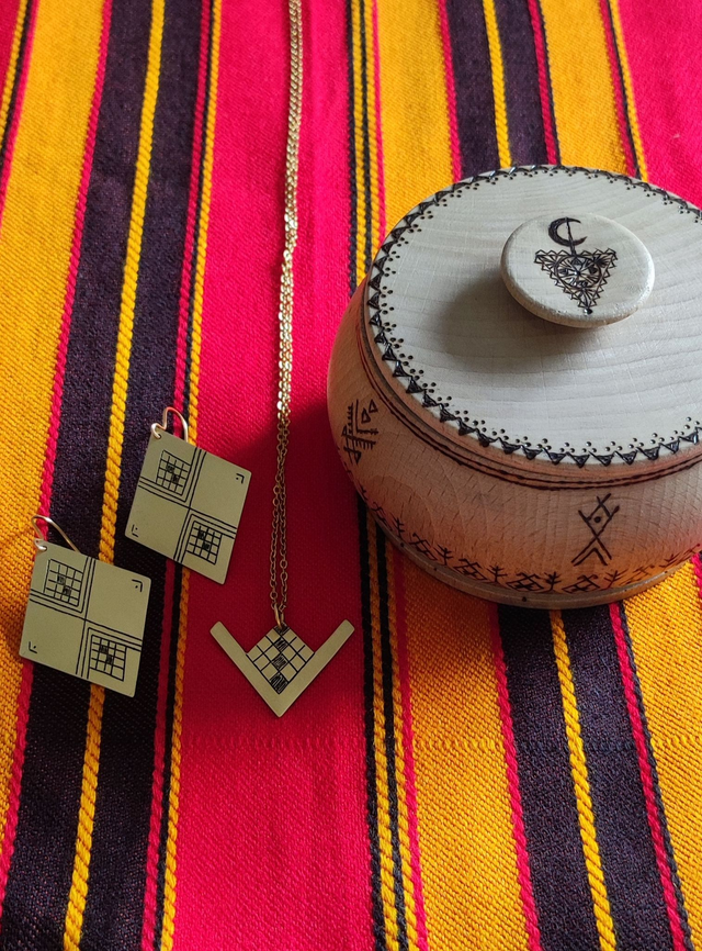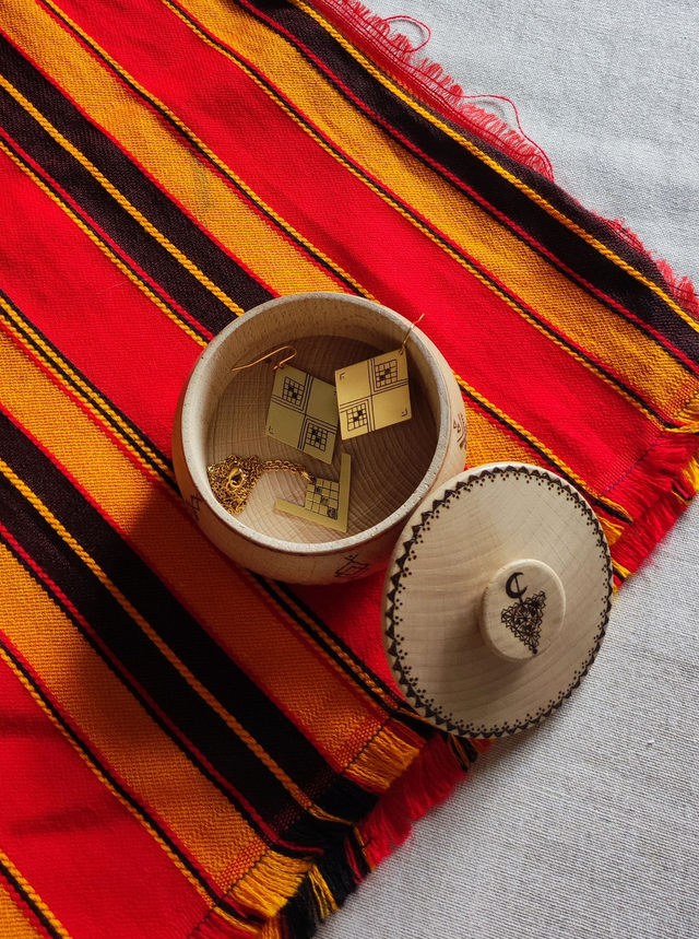 Collaboration Spéciale avec le Bois Tatoué qui sublime de manière unique les objets en bois en pyrogravant des motifs inspirés des cultures du monde. Ici la boîte à bijoux est gravée de symboles amazigh et les bijoux représentent le sexe féminin : la femme amazigh est le pilier de cette culture et nous voulions lui rendre hommage.