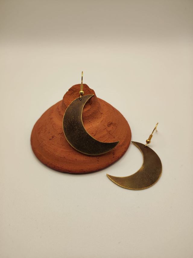 Croissants en laiton brut patiné, texture de fond pailletée.