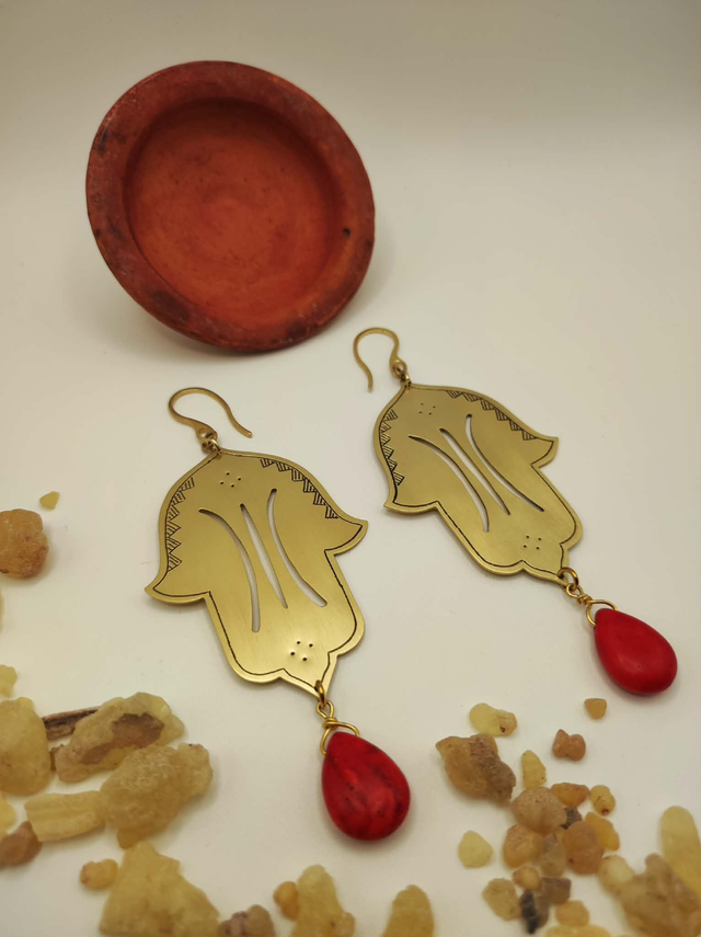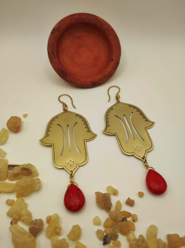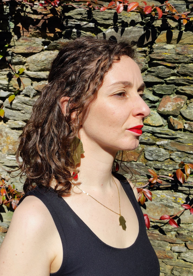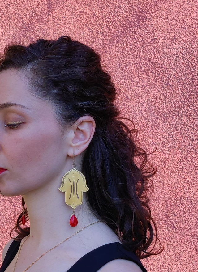 Pièce Unique. Mains de Fatma creusée du symbole de la Salamandre : dans la culture amazigh, elle est associée à l'eau dans laquelle elle vit, et à la lune dont elle épouse la forme, apportant la profondeur, la régénération, la transformation, la croissance... La main protège du mauvais œil et apporte force et bénédiction.