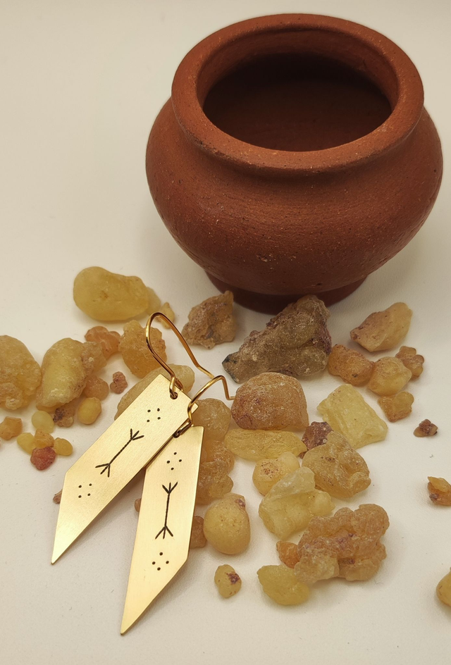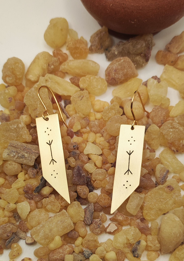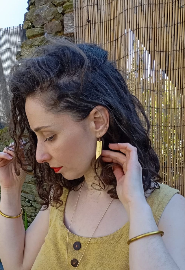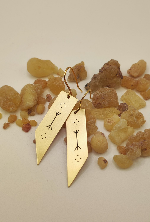 Boucles d'oreilles en laiton en forme d'ailes et gravées du symbole de l'hirondelle, annonciatrice du printemps. Le printemps marque un renouveau, un nouveau départ; ce qui en fait la saison de l'émergence et de la transformation.