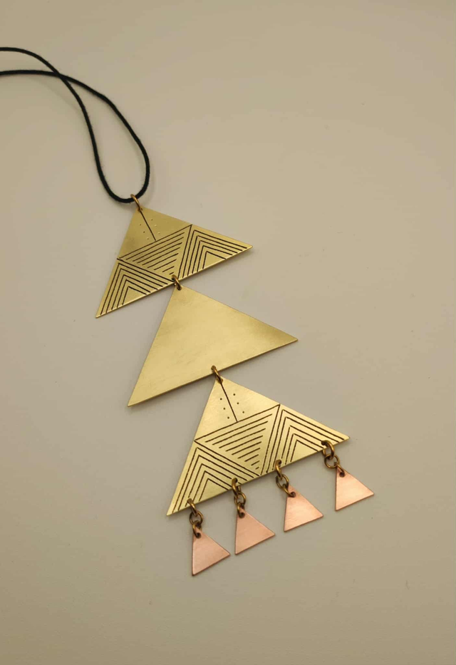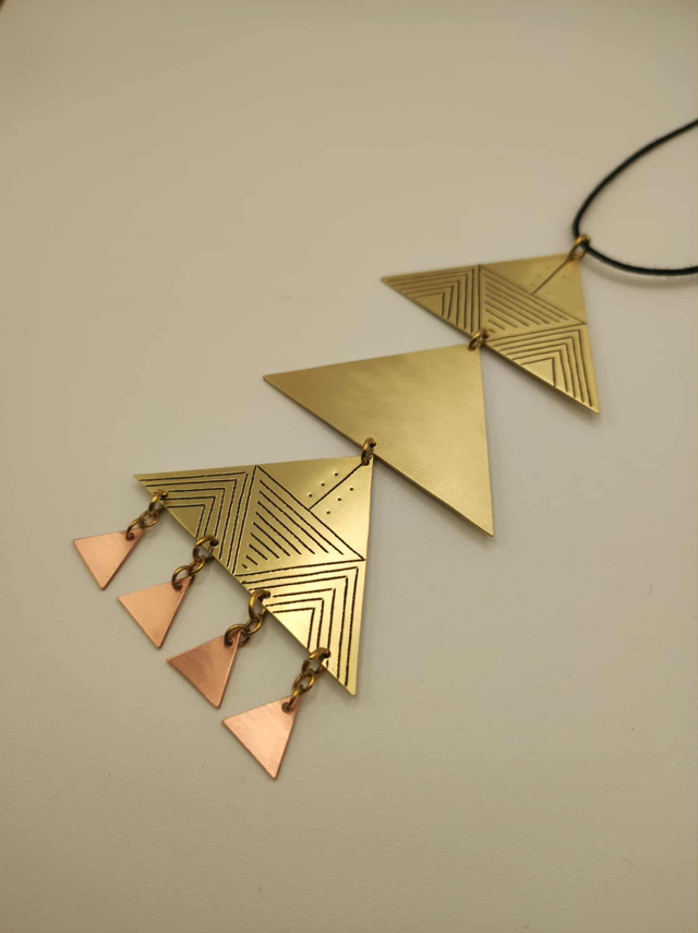 Gros collier en laiton et en cuivre représentant la forme triangulaire des bijoux touareg. Il s'agit d'un hommage à mon apprentissage avec des artisans amazigh.