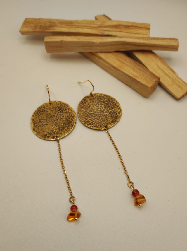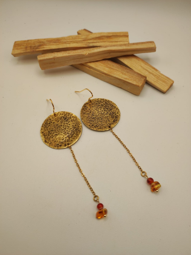 Boucles d'oreilles en laiton martelé et patiné, ornées de deux pierres : la cornaline et l'ambre.